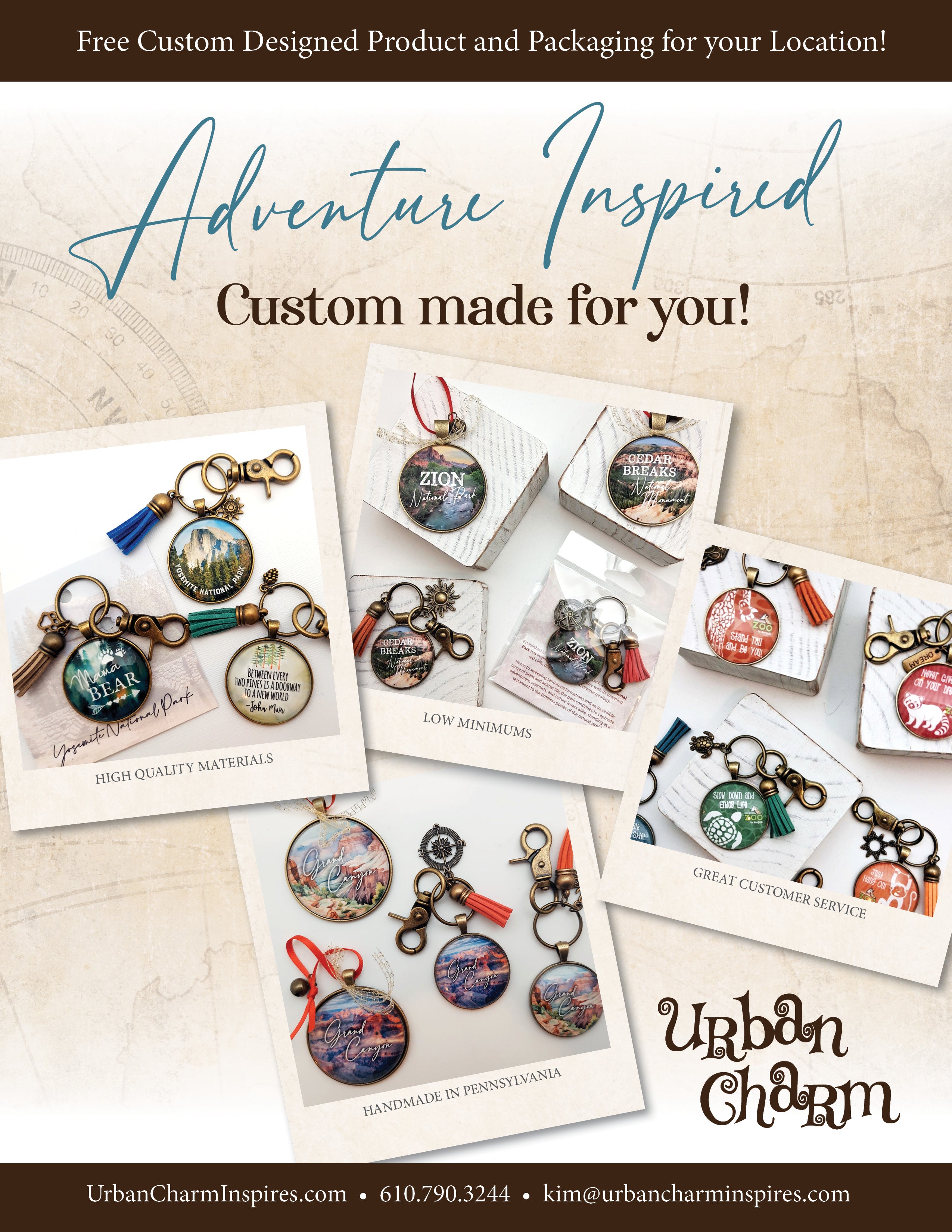 Our handmade jewelry and accessories are custom made for retailers. Urban Charm believes in partnering with gift and souvenir shops, museums, causes and non-profits. In addition to our product line, we specialize in custom made designs!